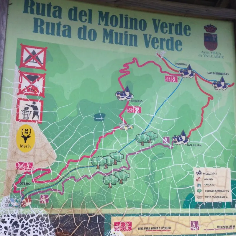 Af en toe voel ik me hier zoals in het liedje van Sting: “Englishman in New York”, maar dan een Hollandse in Spanje. Je hebt toch een bepaald verwachtingspatroon van de dingen, die hier niet altijd op zijn plaats zijn. Zoals vanmiddag toen ik een stuk wilde gaan lopen. Het was supermooi weer en ik had ruim drie uur vrij. Een keertje niet op de Camino, was het plan. Een mens wil ook wel eens wat anders. In het dorp staat een bord met een wandelroute naar de Molino Verde, klinkt goed, dus waarom niet. Ik meende te begrijpen dat de route zo’n anderhalf uur duurde, ook had ik ergens 5,6 km zien staan. Prima, leek me, dus ik op pad. Het eerste stuk ging meteen flink bergopwaarts, maar hé, dat ben ik inmiddels wel gewend.